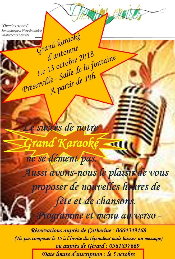 Un grand classique de notre association. Grâce à l'efficience et l'opiniâtreté de Catherine, un KARAOKE a été organisé de nouveau à la salle La Fontaine, prêtée gracieusement par la mairie, plus de cent personnes se sont retrouvées devant un magnifique buffet et ont eu la joie jusque tard dans la nuit de chanter sur un répertoire varié et individualisé, seul ou en groupe, pendant que d'autres les écoutaient pour leur plus grand plaisir. De 7 à 77 ans, tous ont pu trouver leur bonheur, pas une fausse note pour Catherine qui a animé la soirée d'une main de maître, tandis que notre petite équipe a su, je pense, satisfaire les participants. On a déjà hâte d'en redemander en 2019.