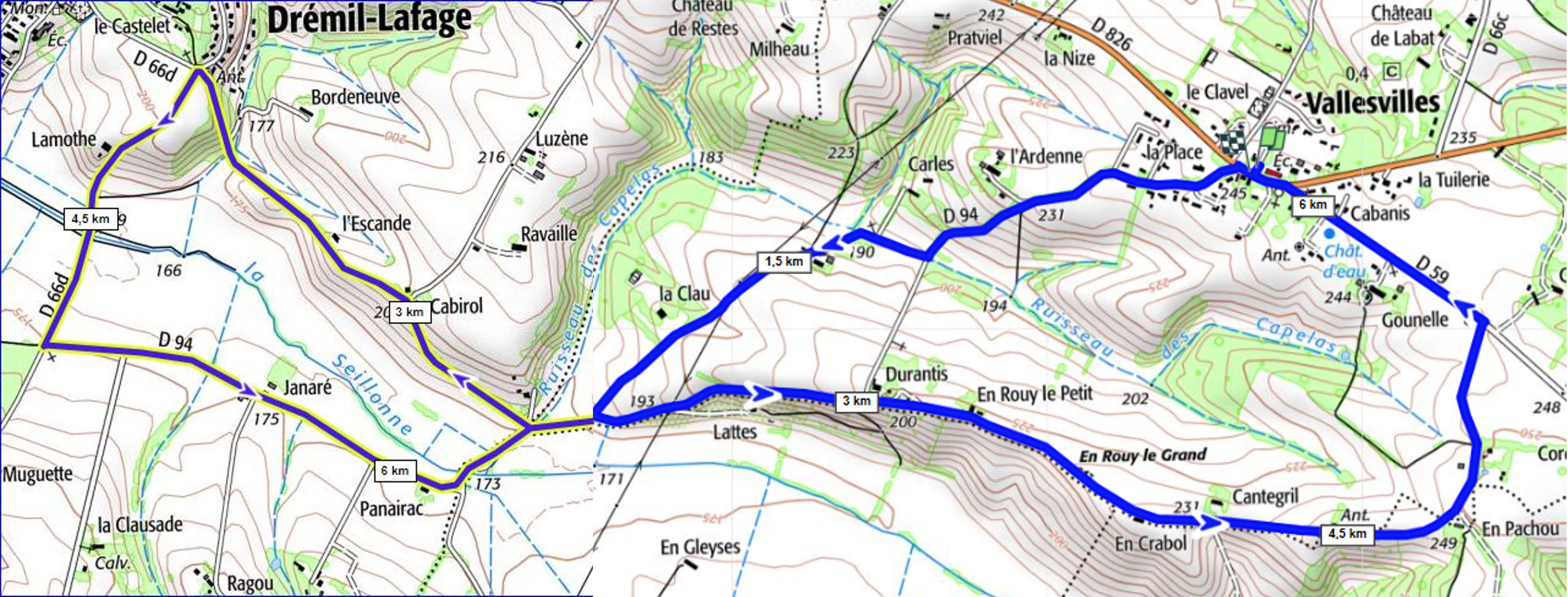 Vallesvilles - Drémil-Lafage - Vallée de la Seillonne (10 km) et circuit court (6 km).